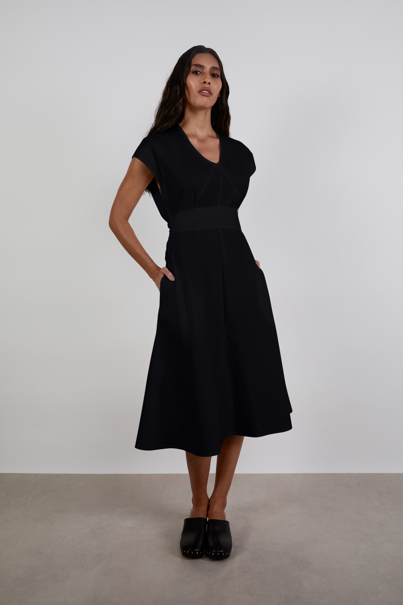 A versatile midi dress cut from crisp, breathable cotton poplin. Designed with a flattering V-neck and subtle panel cuts that create natural structure and soft volume. Effortless to dress up or down.