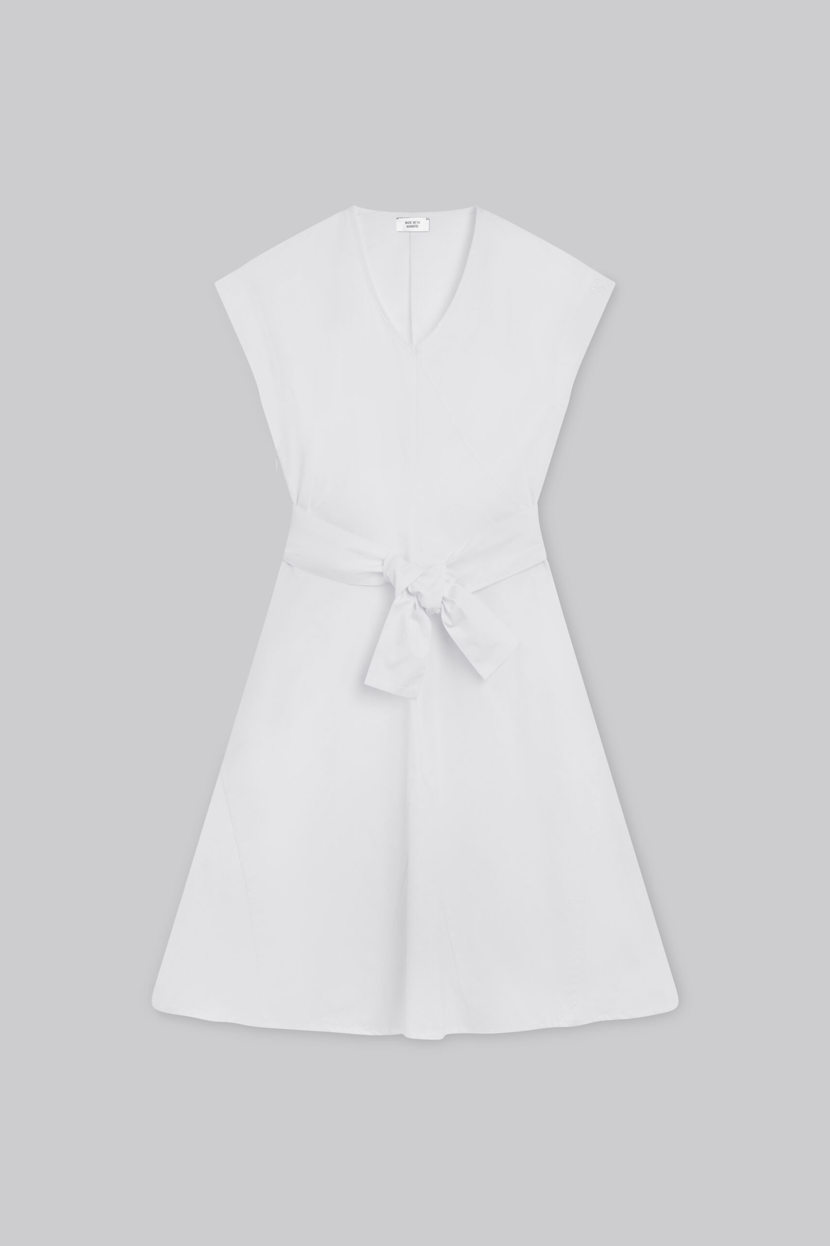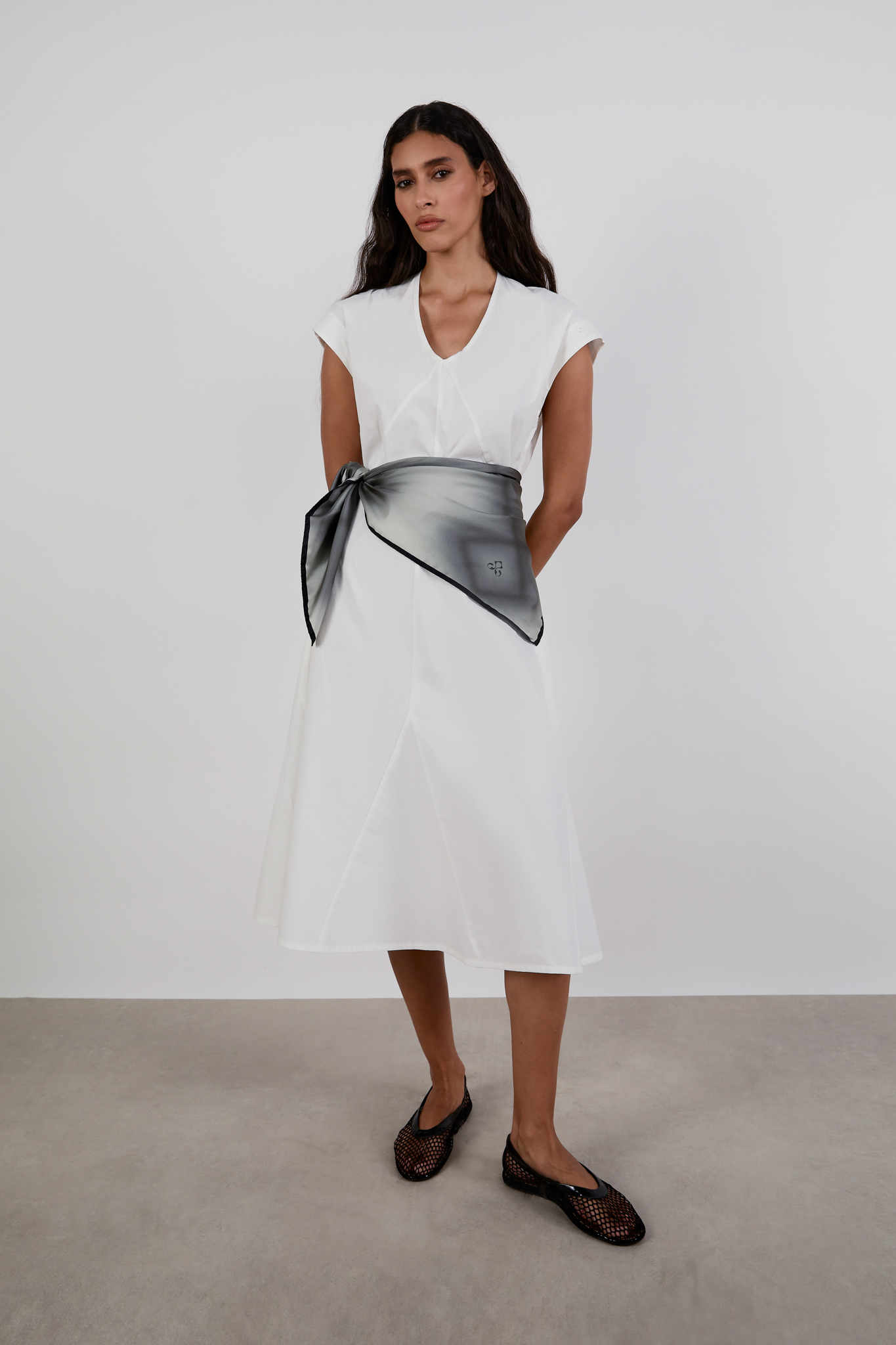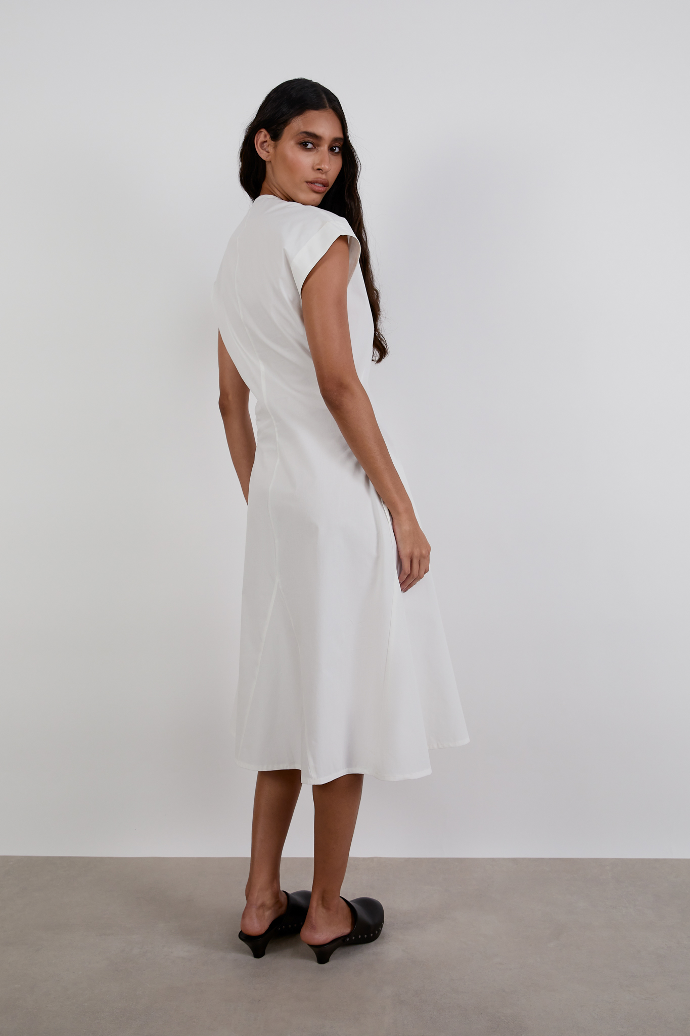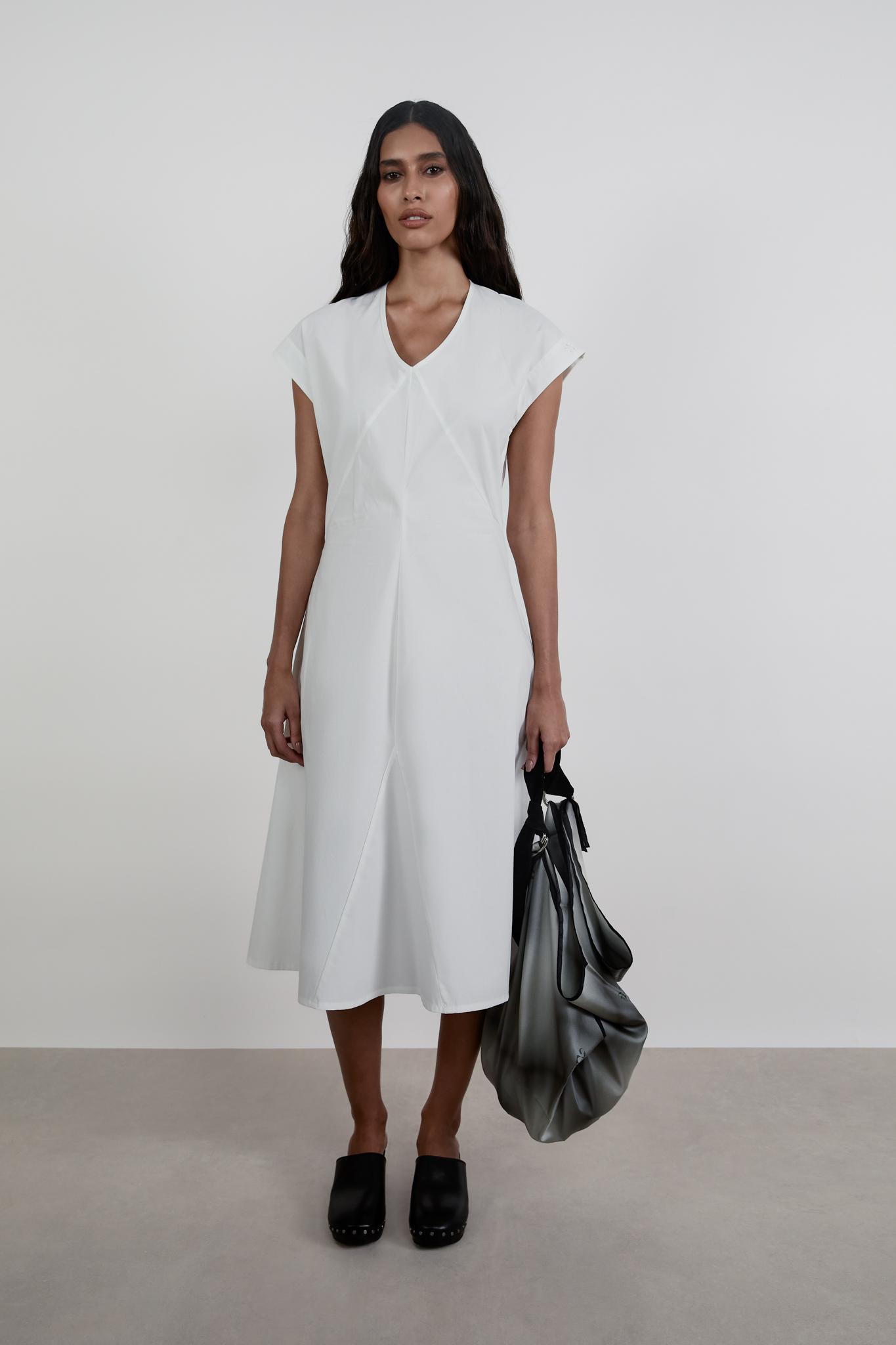 A versatile midi dress cut from crisp, breathable cotton poplin. Designed with a flattering V-neck and subtle panel cuts that create natural structure and soft volume. Effortless to dress up or down.
